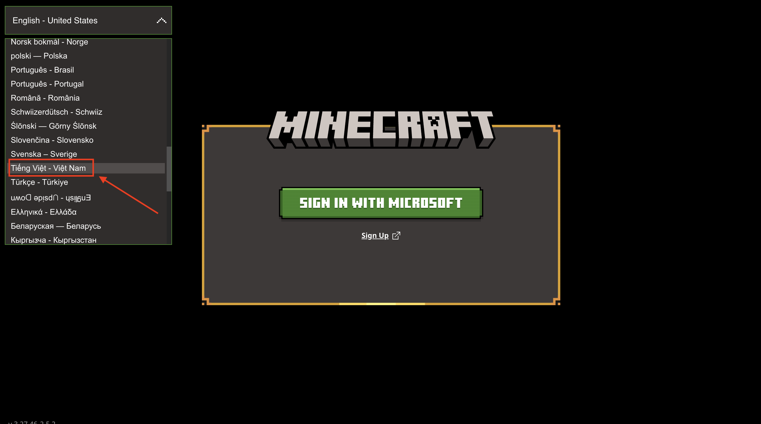 Minecraft hiện đã hỗ trợ ngôn ngữ tiếng Việt, rất tiện cho người mới chơi. Không cần phải lựa chọn phức tạp, bạn có thể chọn ngôn ngữ ngay bên ngoài giao diện đăng nhập.